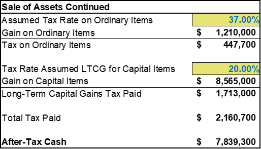 What about the sale of assets? This is a more complicated tax exercise. IRC Section 1060 instructs both the Buyer and Seller to allocate the total tax consideration among seven asset classes, Classes I – VII based on relative fair market value. The Seller then determines the Company’s tax basis of each class, and based on the allocation of tax purchase price to each class, determines the total gains and losses on all of the assets.[11] Any residual purchase price after allocating purchase price to Classes I through VI is allocated to Class VII assets. For simplicity, we assume that no PTET is paid by the Company, the balance sheet is stated as below, the taxpayer has no tax basis in accounts receivable and has fully-depreciated PP&E/fixed assets. We also assume the fair market value of the inventory has appreciated. Further, we assume that none of the fixed assets are taxed at the 25% tax recapture rate generally for certain depreciable real property, and that all ordinary items are taxed at 37%. We also did not depict state and local taxes or any NIIT.[12]