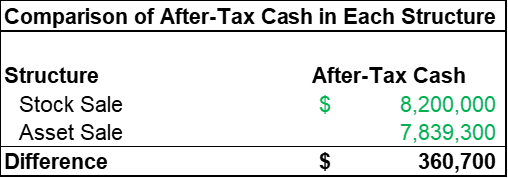 Based on the facts and assumptions in these models, Seller’s after-tax cash in an asset sale is $7,839,300 versus $8,200,000 in a stock sale.