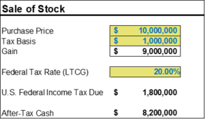 For illustration purposes, see the following table showing how the sale of stock will be treated given the following assumptions and calculations (excluding state taxes and NIIT). If the purchase price of Shareholder’s business is $10 million, and Shareholder had $1 million of tax basis in the Company stock, and assuming the holding period for long-term capital gains is met, the calculation of gain from a pure stock sale should look as follows: