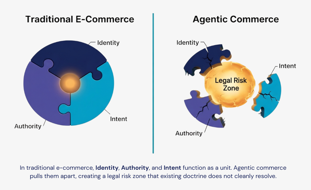 That distinction is the threshold problem. Identity does more work in commerce than most participants admit. It is not just an authentication issue. It is the basis on which merchants decide pricing and whether to transact, how payment systems decide whether to clear, how platforms decide whether to allow access, and ultimately how courts later decide whose act the law should recognize.