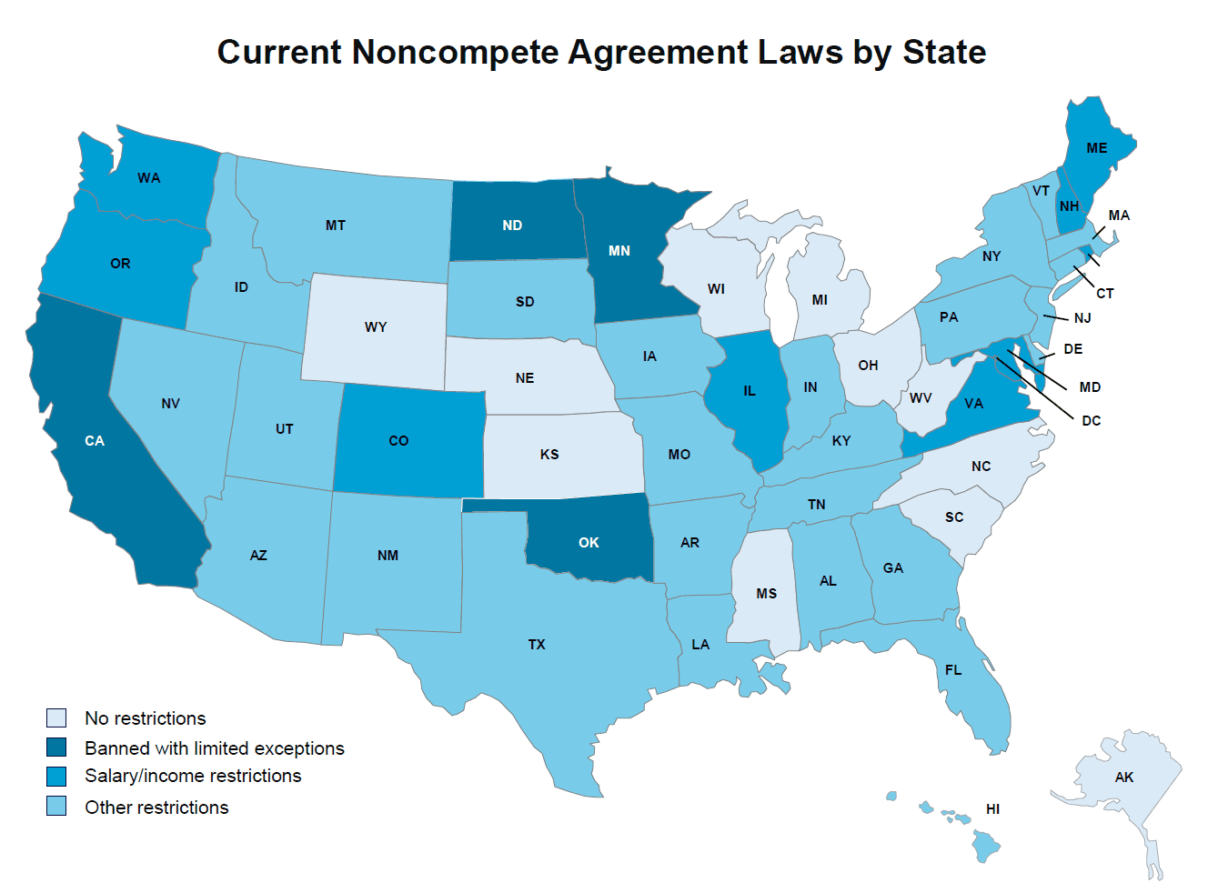 [1] California, Oklahoma, Minnesota, and North Dakota all generally ban non-competes in employment with limited exceptions such as restrictions tied to the sale of a business.