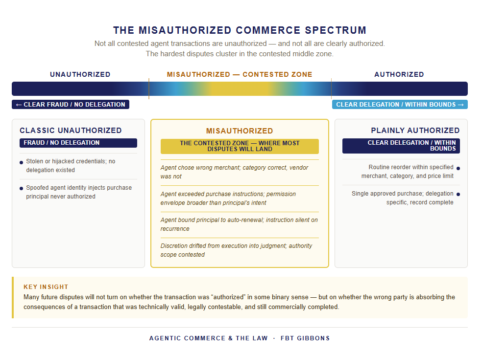 The third, and perhaps most challenging category to consider, are the misauthorized cases. The principal did delegate something. The agent did act through a genuine system. The merchant may have relied on legitimate signals. However, the result still feels unauthorized in the way that matters once the transaction is challenged. The difficulty is that whether a given transaction falls into this third category (vs. one of the first two) is precisely what the parties will dispute. The category lines are not self-executing.